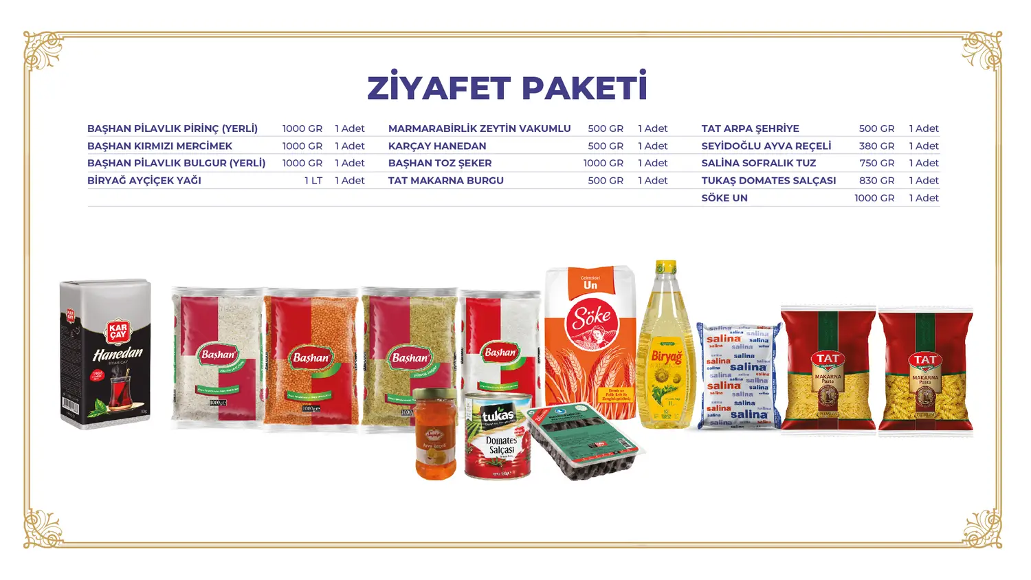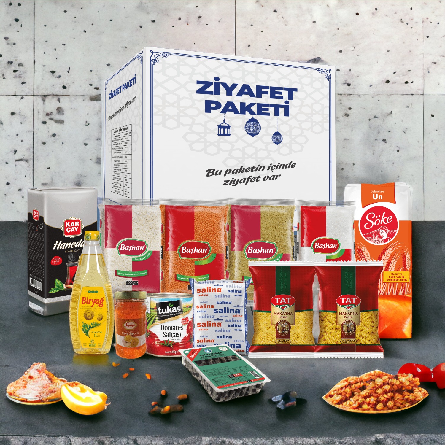 Hazır gıda kolileri, yardım etmek isteyenler için hızlı ve kolay bir yol sunar. Ziyafet Paketi ürünü bir ailenin 15 günlük mutfak ihtiyacını karşılamaktadır.